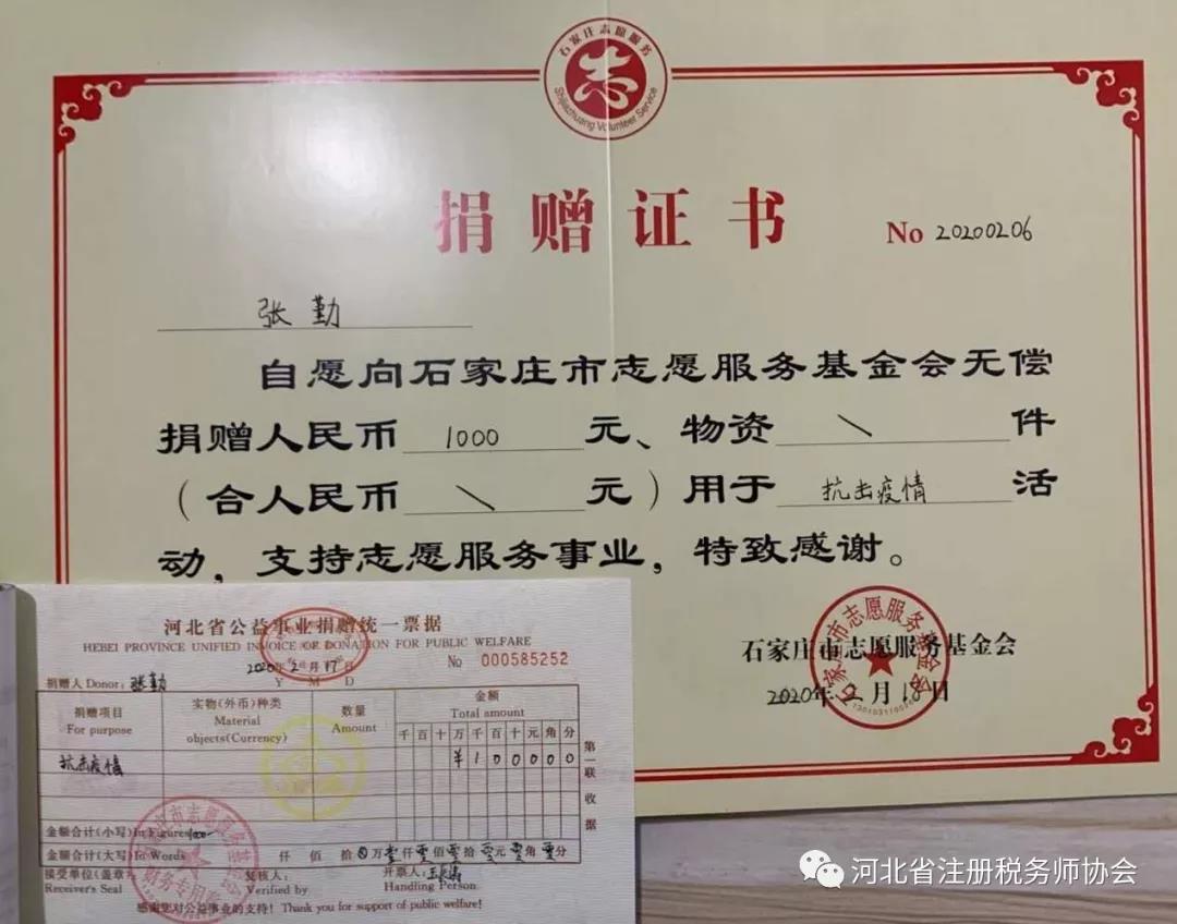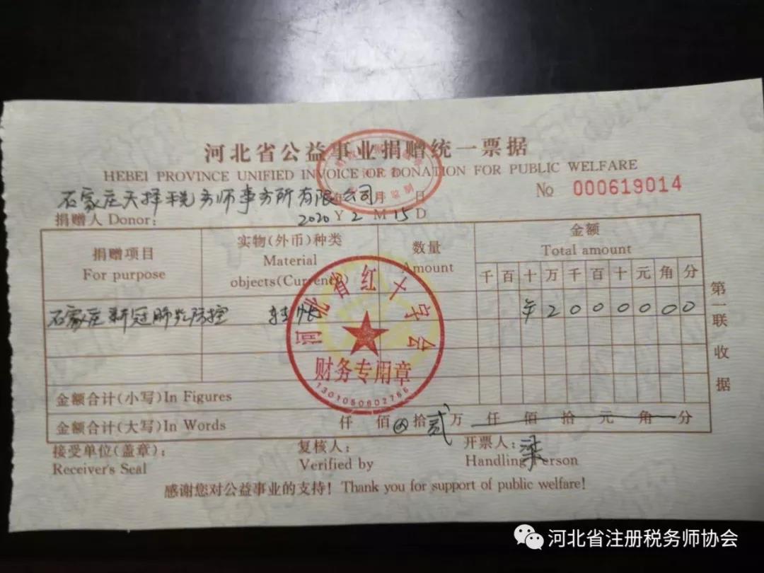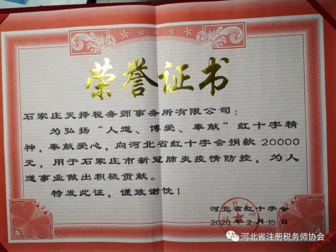 2、所長(zhǎng)張勤在2月中旬看到疫情還在蔓延,看到那些遭受病毒折磨的同胞,那些堅(jiān)守在一線的‘戰(zhàn)士’。深感作為稅務(wù)師,就應(yīng)全力奉獻(xiàn)自己的力量,跟全國(guó)人民一起打贏這場(chǎng)戰(zhàn)役。隨后石家莊天擇稅務(wù)師事務(wù)所再捐款兩萬(wàn)元用于新型冠狀病毒肺炎的疫情防控。