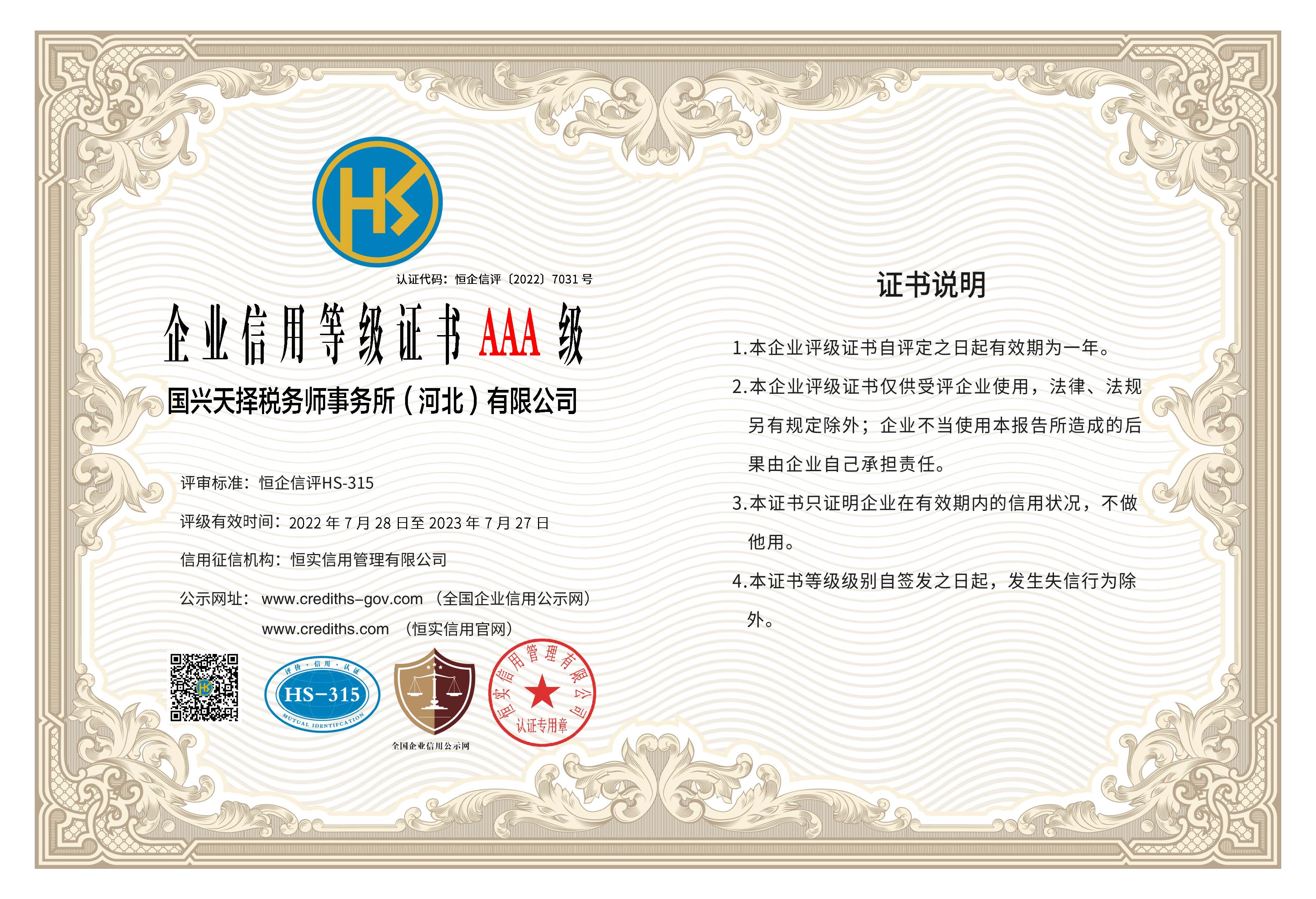 2022年7月,國興天擇稅務師事務所(河北)有限公司順利取得了“AAA級企業(yè)信用等級證書”。這標志著我司在規(guī)范運營、誠信經(jīng)營上得到了相關(guān)部門及權(quán)威機構(gòu)的認可。