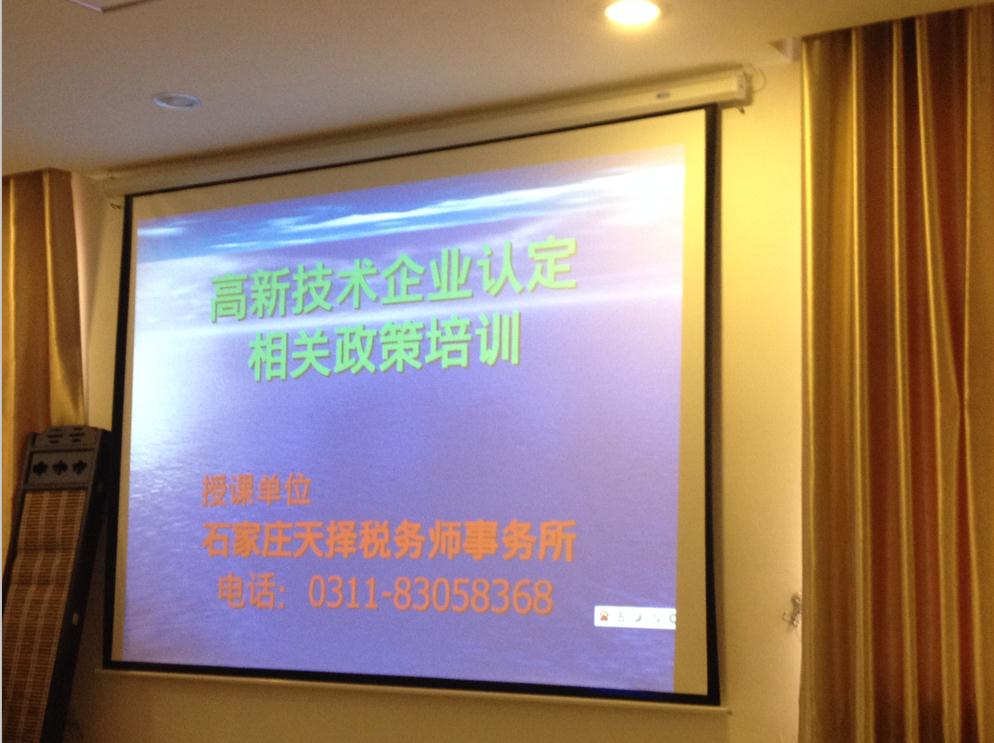 2015年1月14日,成安縣科技局召開了高新技術(shù)企業(yè)認(rèn)定培訓(xùn)會,培訓(xùn)會由我公司張勤總經(jīng)理親臨現(xiàn)場授課,針對企業(yè)如何申報高企、高企優(yōu)惠政策、企業(yè)研發(fā)費(fèi)用加計扣除等方面進(jìn)行了詳細(xì)的講解。會上免費(fèi)發(fā)放了天擇稅務(wù)師事務(wù)所印制的“高新技術(shù)企業(yè)認(rèn)定方略”、“稅收政策輯要”等資料。